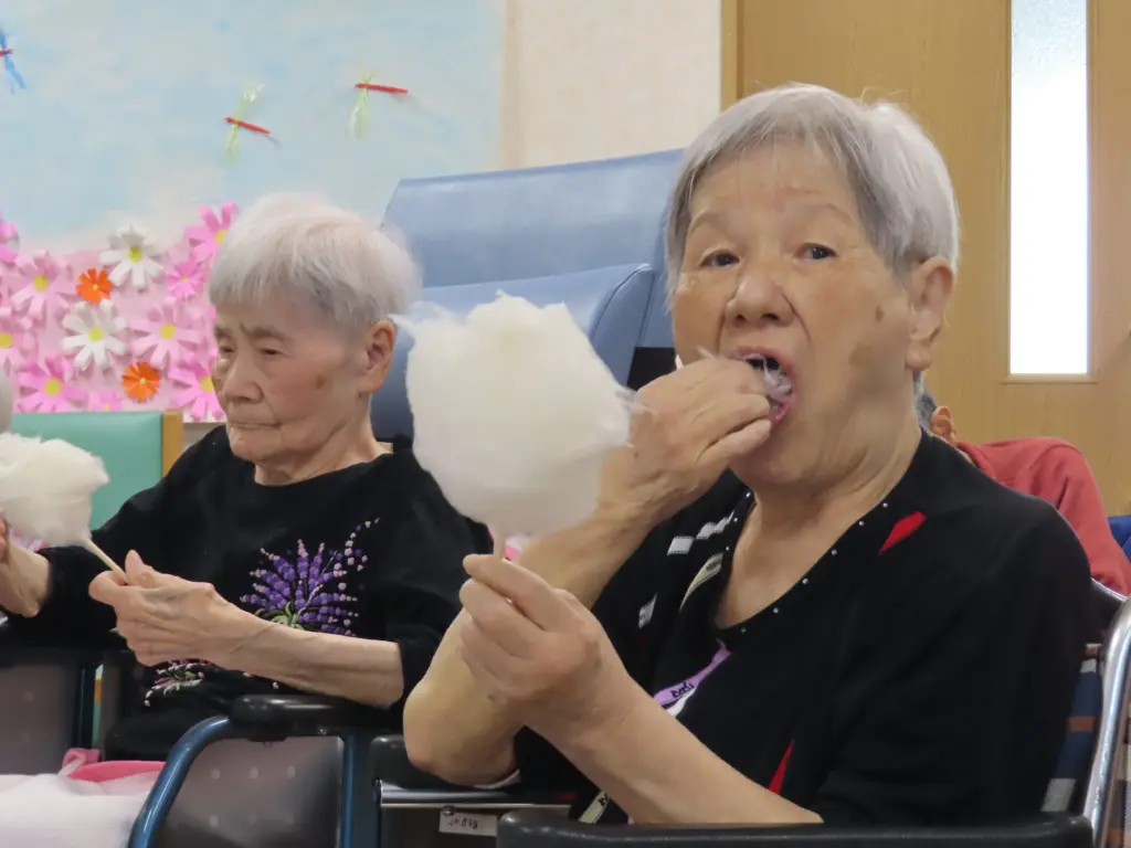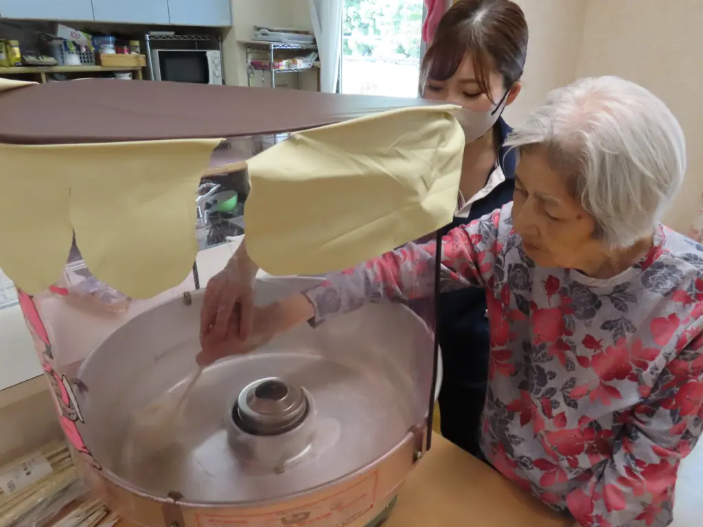夏の厳しい暑さも和らいできた9月下旬。この日はスタッフが考えたお祭り企画をグループホーム内で開催しました。地区からの機材貸し出しなどのご厚意を活用し、実際にお祭りで使われる大型のわた菓子作りの機械を施設内に設置。ザラメを入れると一気に”わた”が膨らむ様子に、入居者もスタッフも驚きの表情を見せていました。割りばしに巻かれた大きなわた菓子は見た目こそ少し不格好でしたが、楽しみながら味わっていただけました。