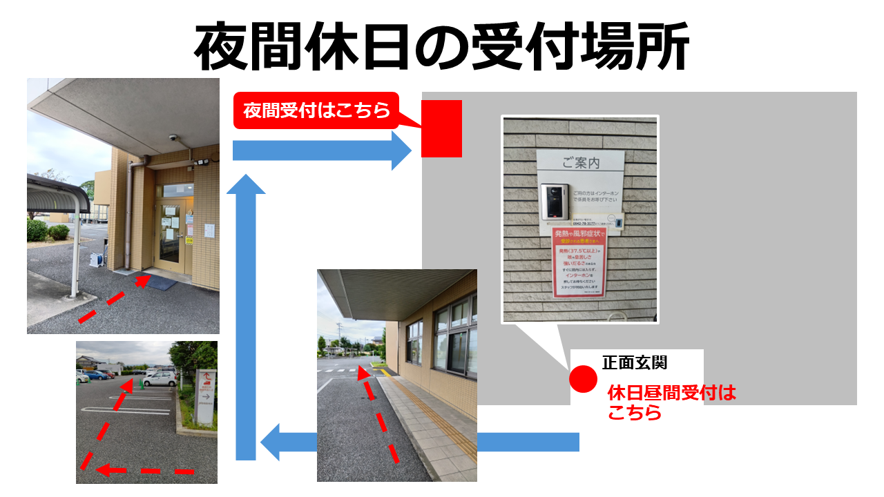 夜間の場合は入口が正面ではなく、病院裏側での受付となりますのでご注意ください。